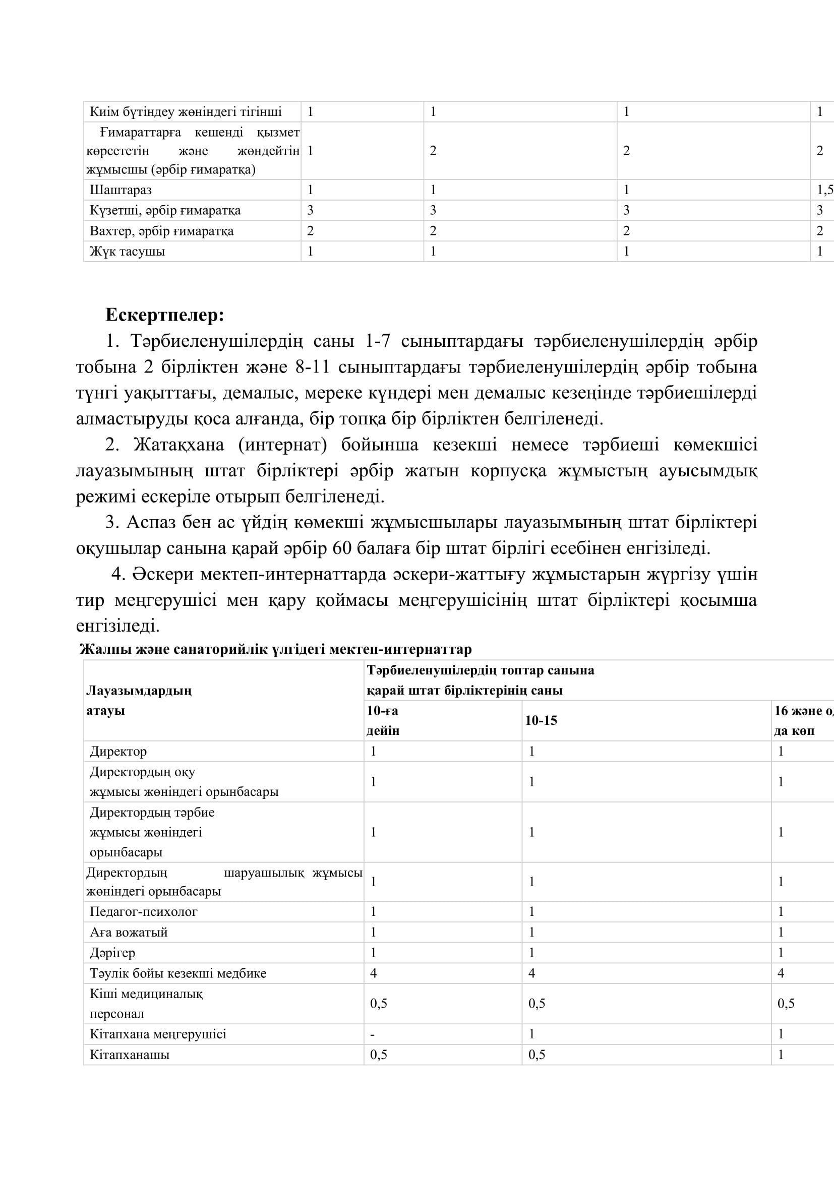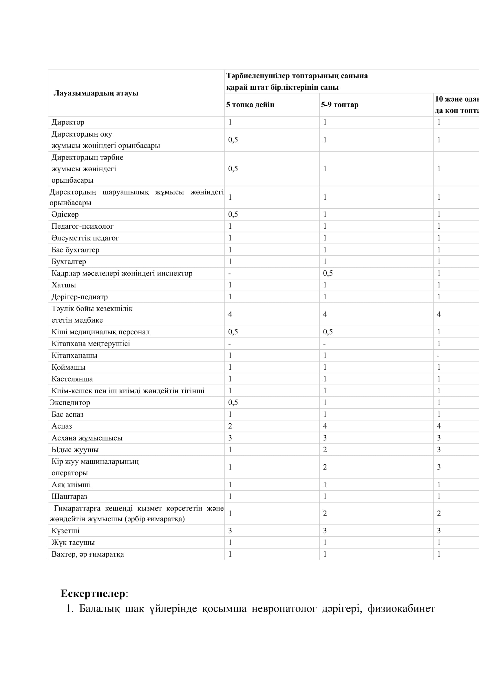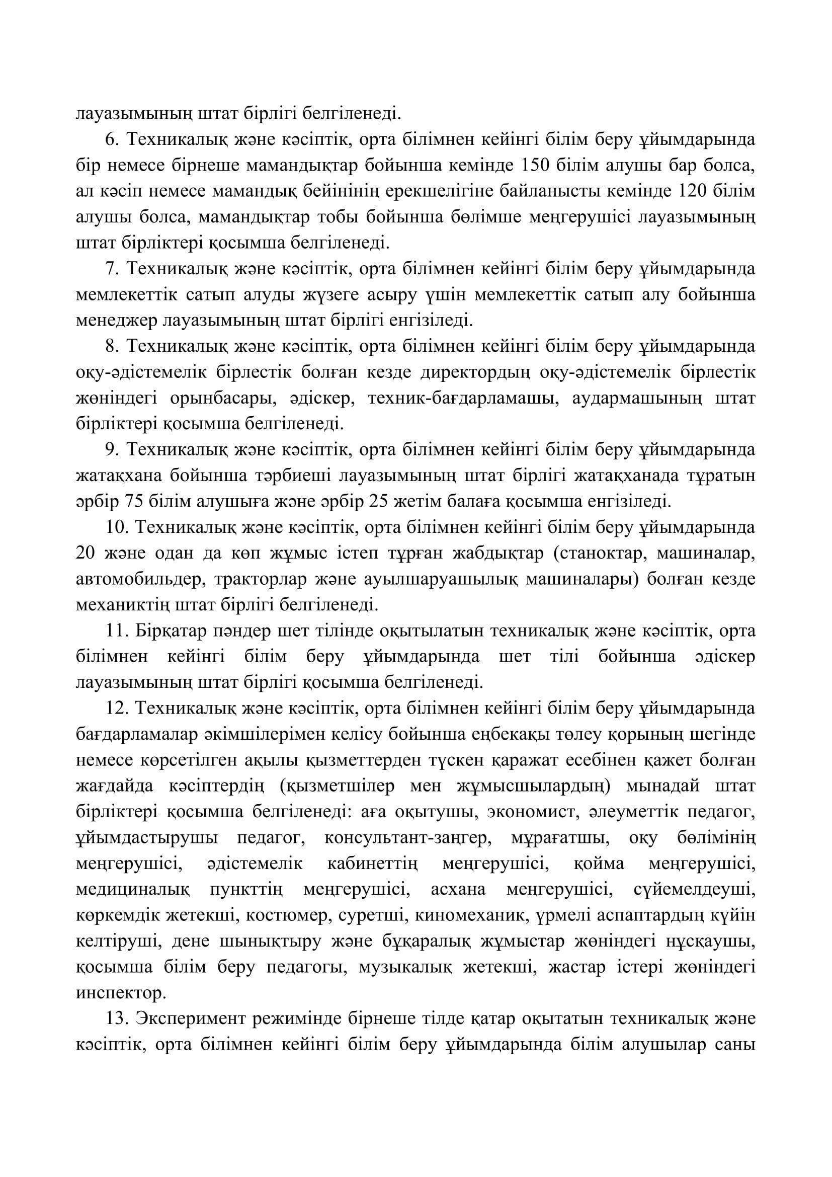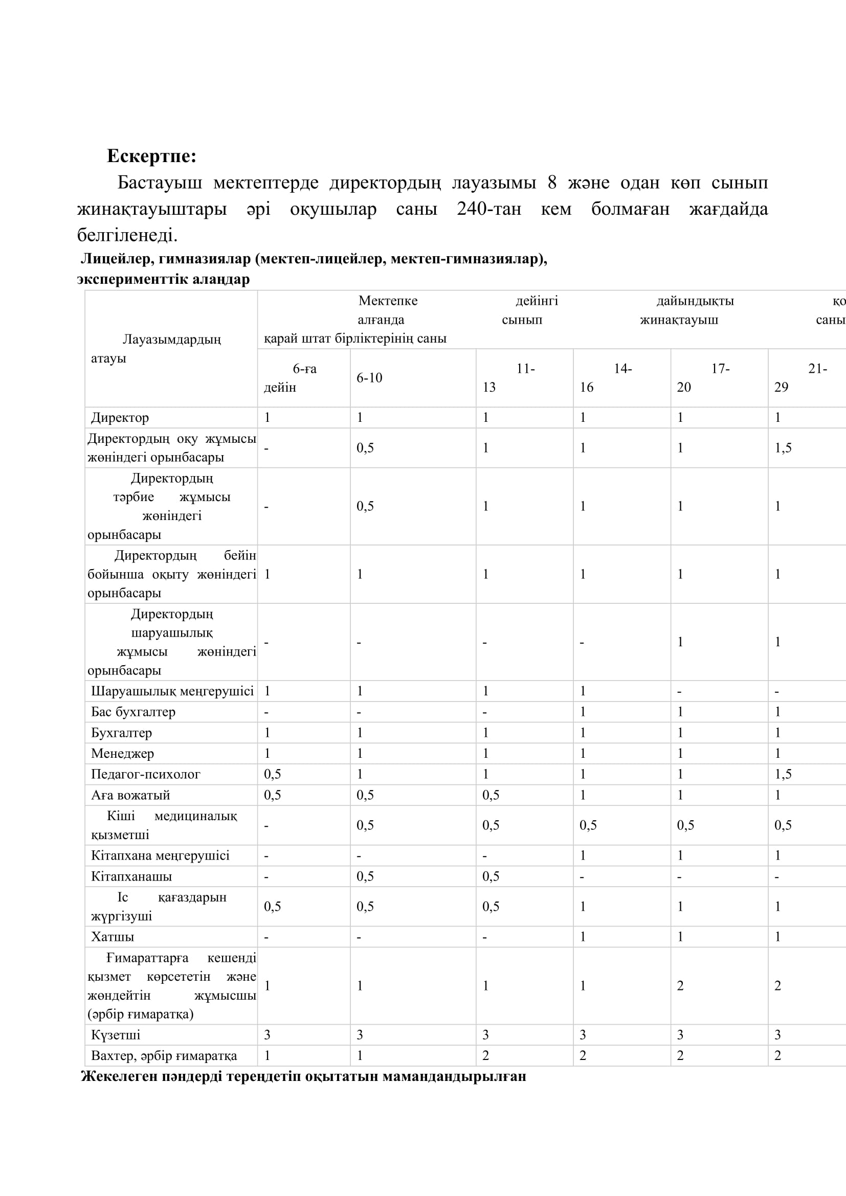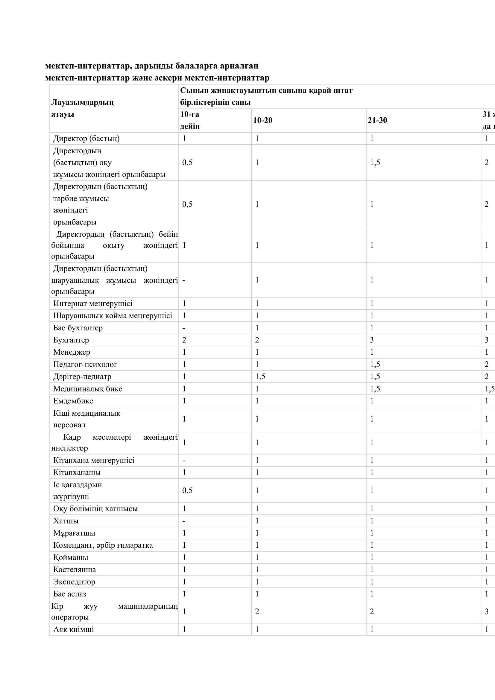 Мемлекеттік білім беру ұйымдары қызметкерлерінің үлгі штаттарын және педагог қызметкерлер мен оларға теңестірілген адамдар лауазымдарының тізбесін бекіту туралы » №110 мектеп-лицей