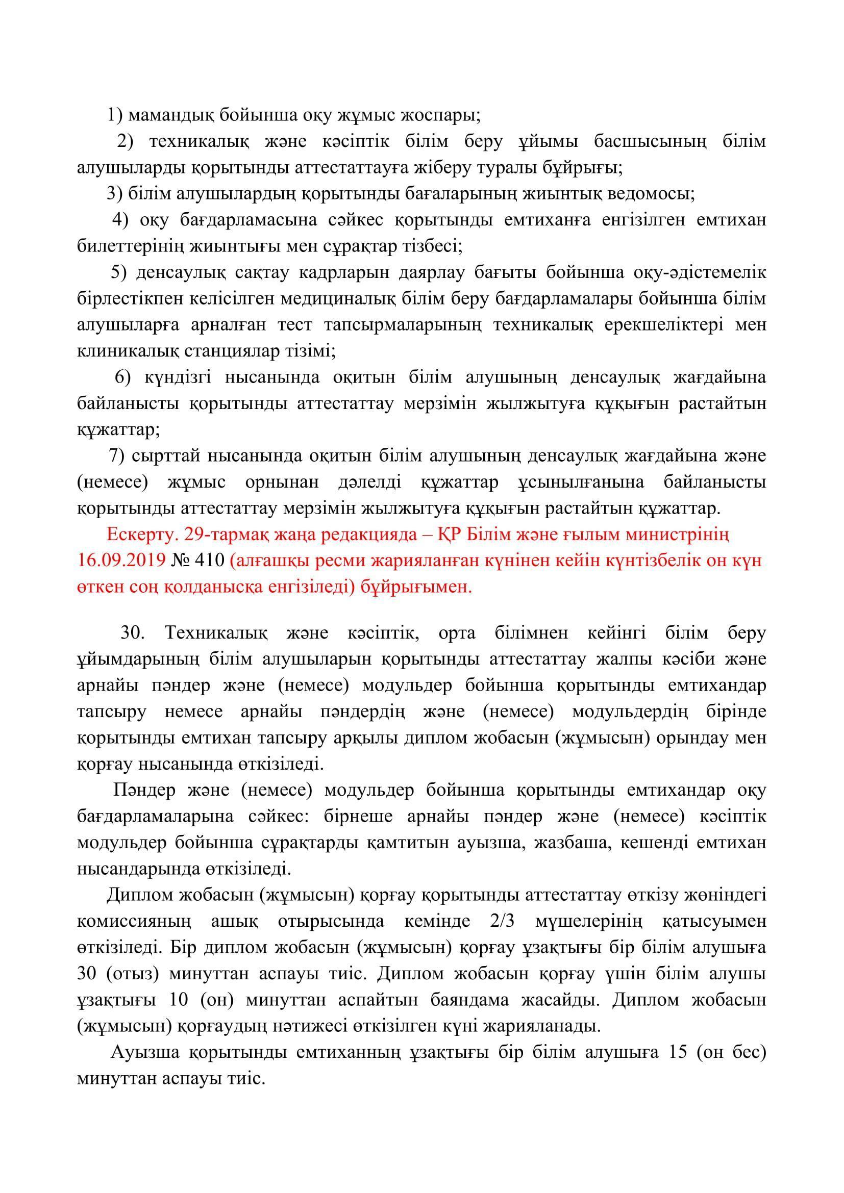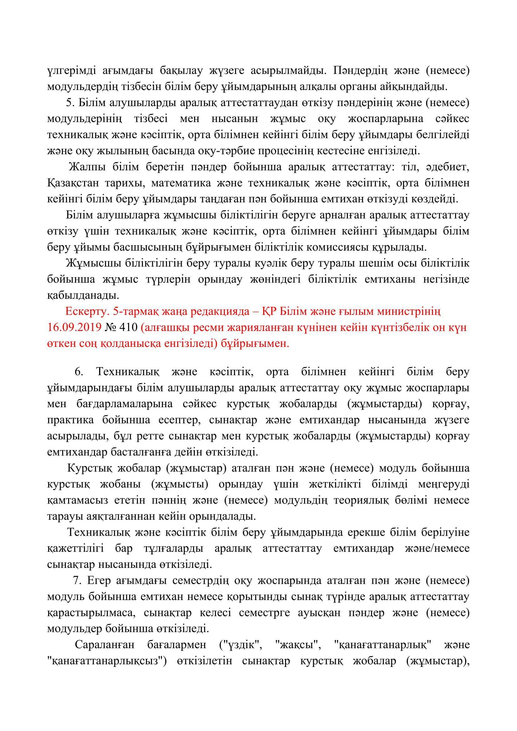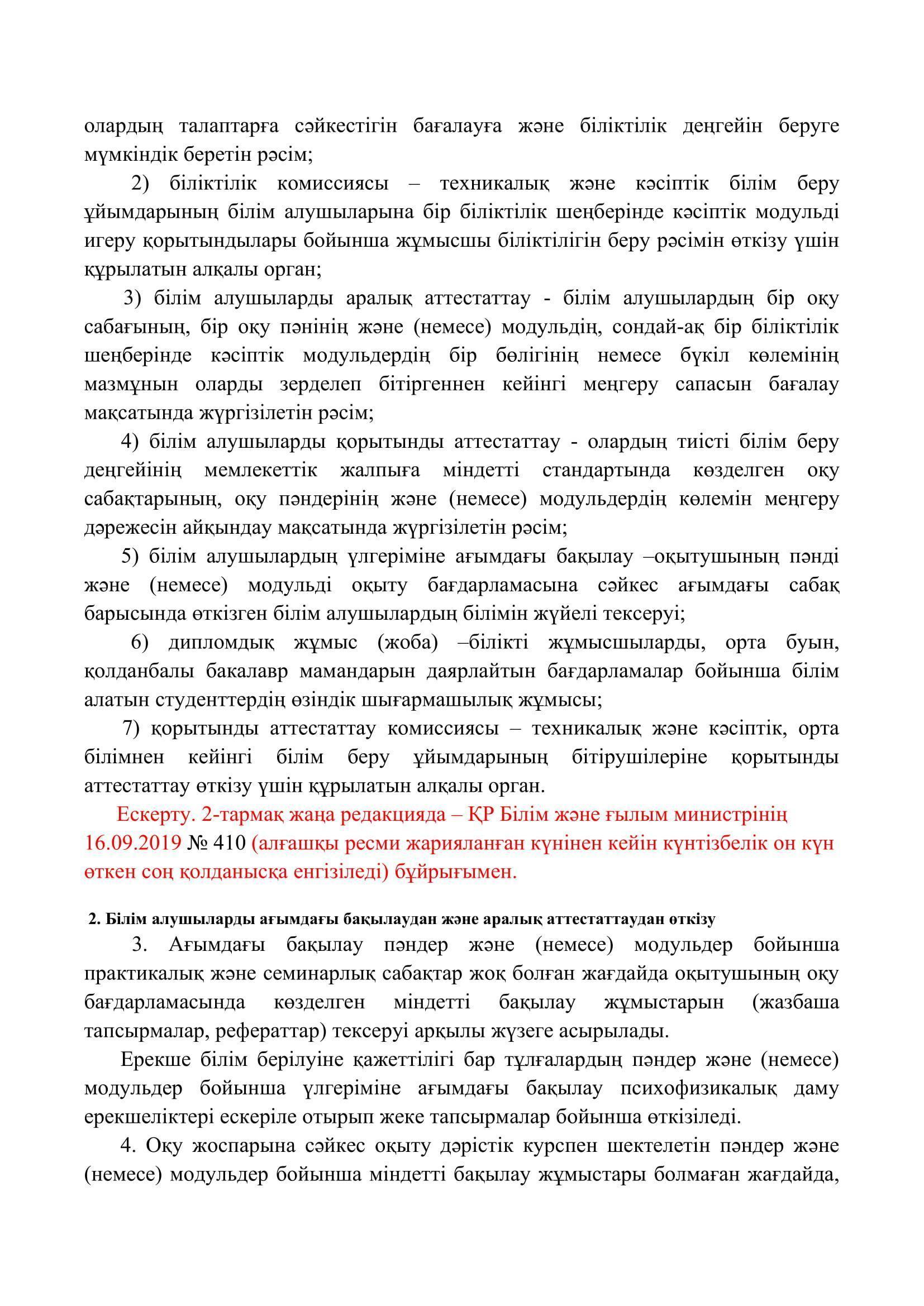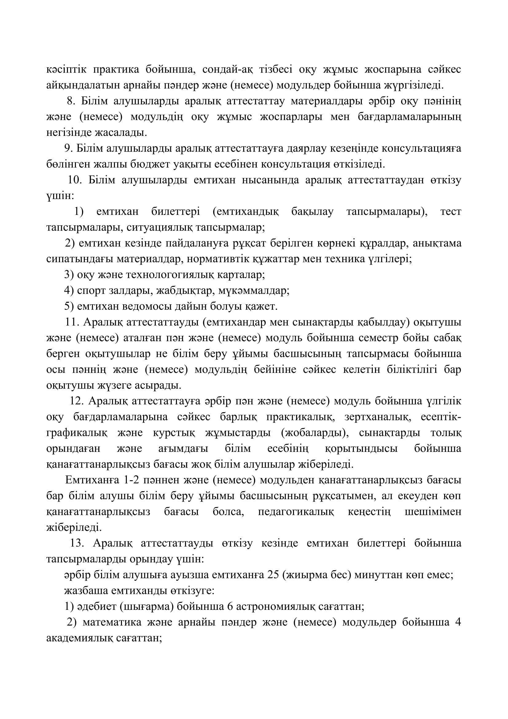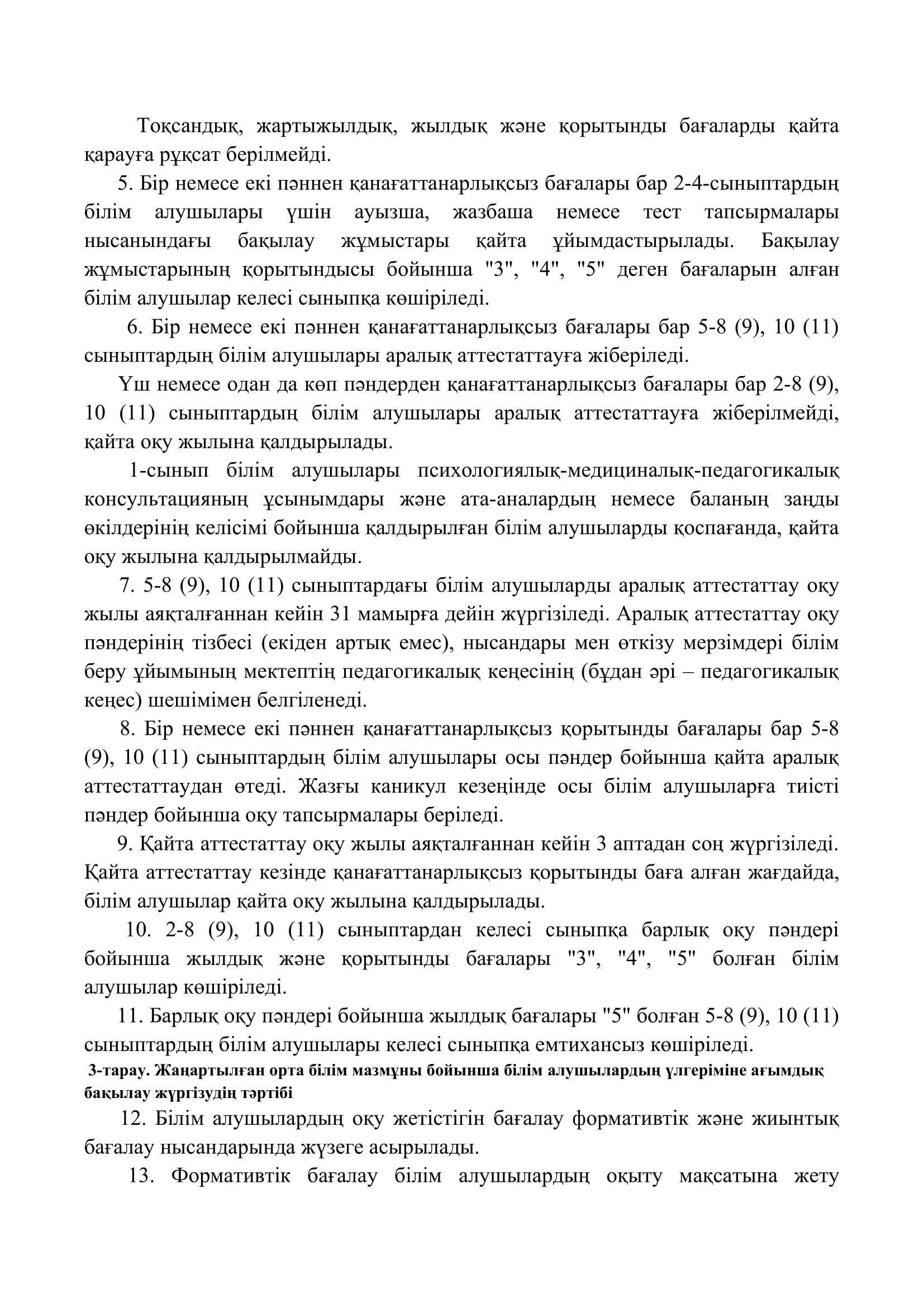 №110 мектеп-лицей » Біз туралы » Нормативтік құжаттар » Орта, техникалық және кәсіптік, орта білімнен кейінгі білім беру ұйымдары үшін білім алушылардың үлгеріміне ағымдағы бақылауды, оларды аралық және қорытынды аттестаттауды өткізудің үлгілік қағидаларын бекіту туралы