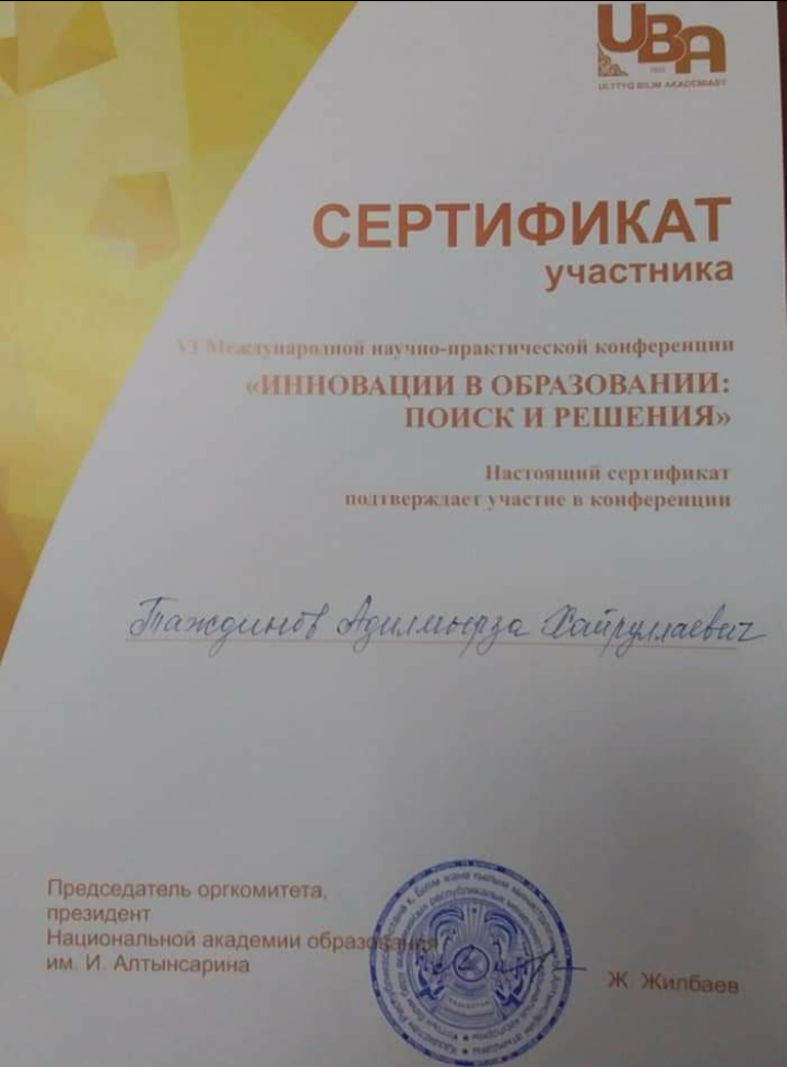 №110 мектеп-лицей директоры Таждинов Адилмырза VI Халықаралық ғылыми практикалық конференцияға қатысып білім берудегі инновациялық ізденіс және шешім тақырыбында тың идеялар айтқаны үшін Ы.Алтынсарин атындағы ұлттық академияның президенті Ж.Жилбаевтан сертификат табысталды