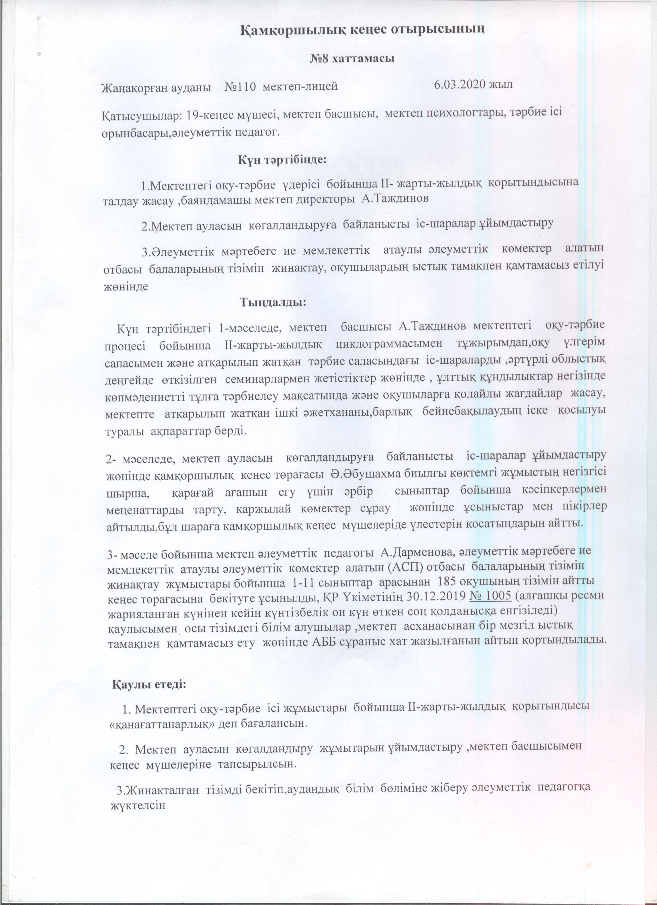 Қамқоршылық кеңестің хаттамалары » №110 мектеп-лицей