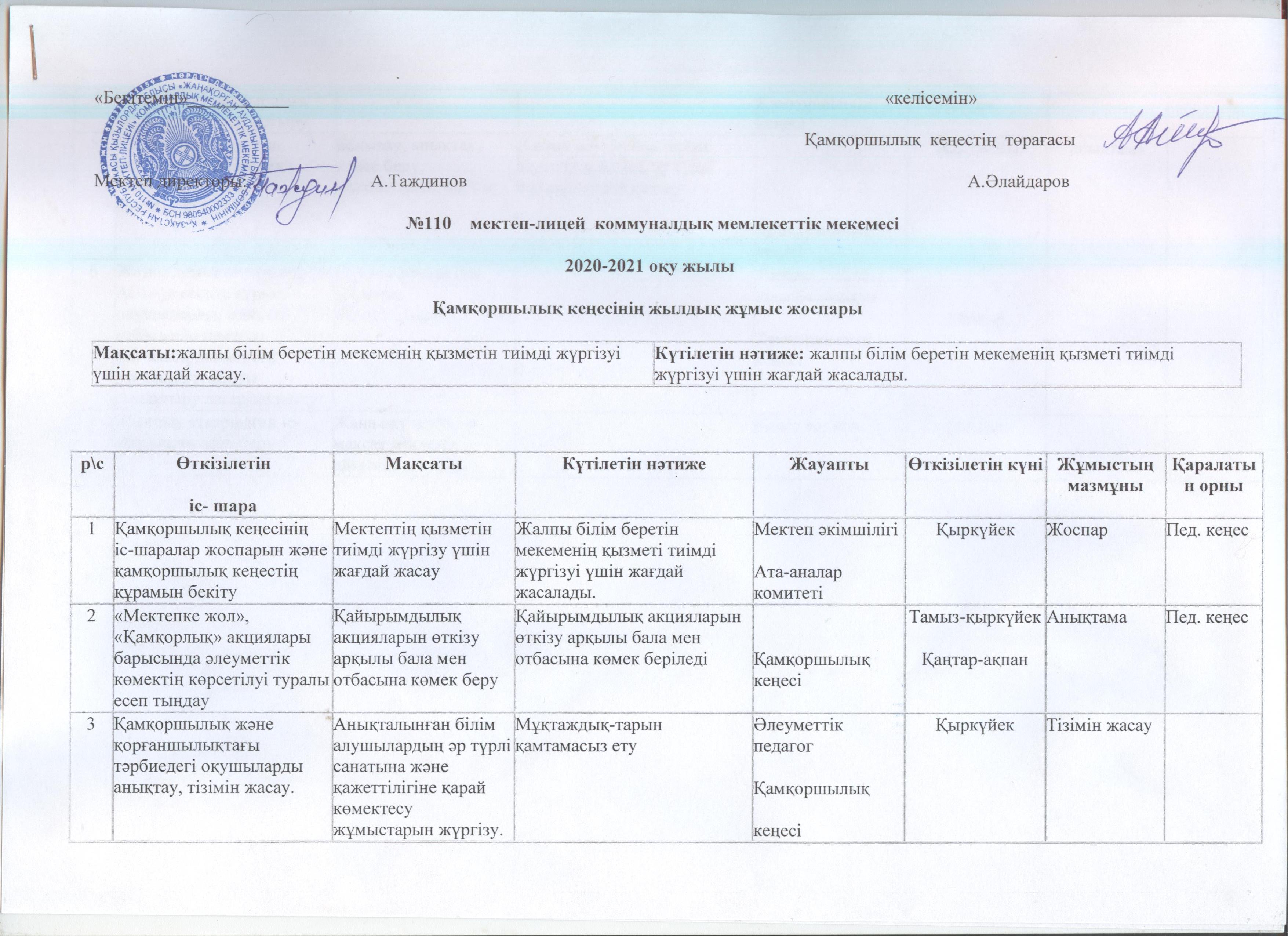 Қамқоршылық кеңестің жылдық жұмыс жоспары » №110 мектеп-лицей