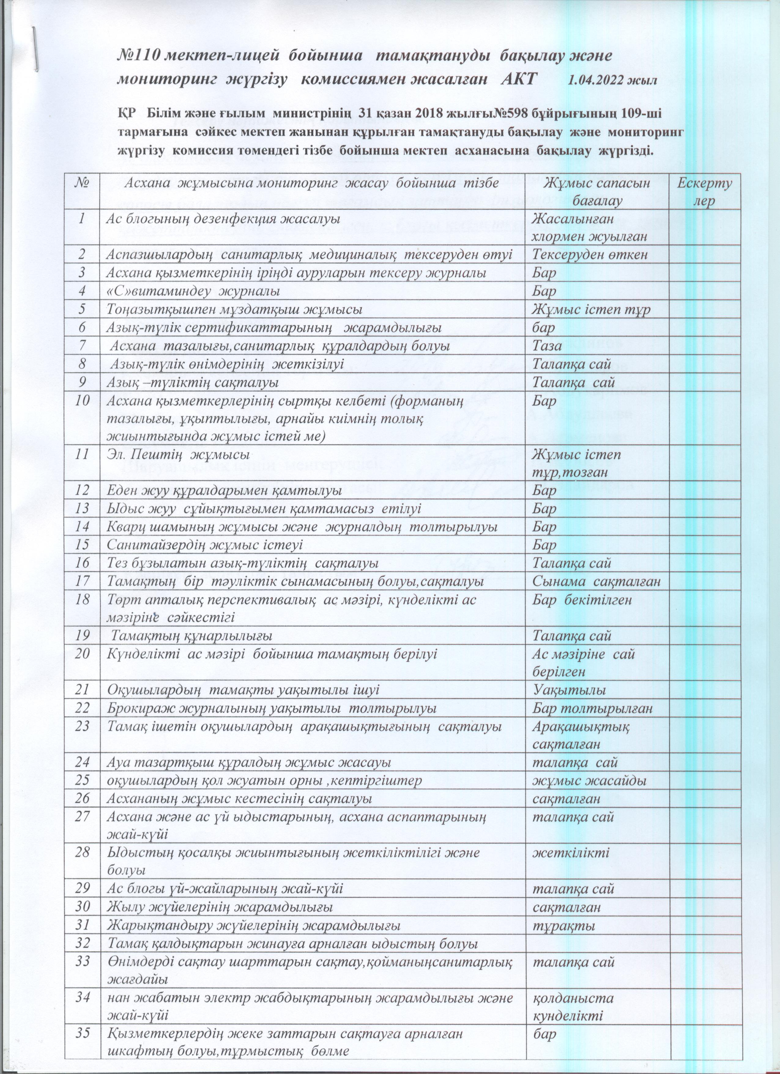 Мониторнинг жүргізу АКТсі » №110 мектеп-лицей